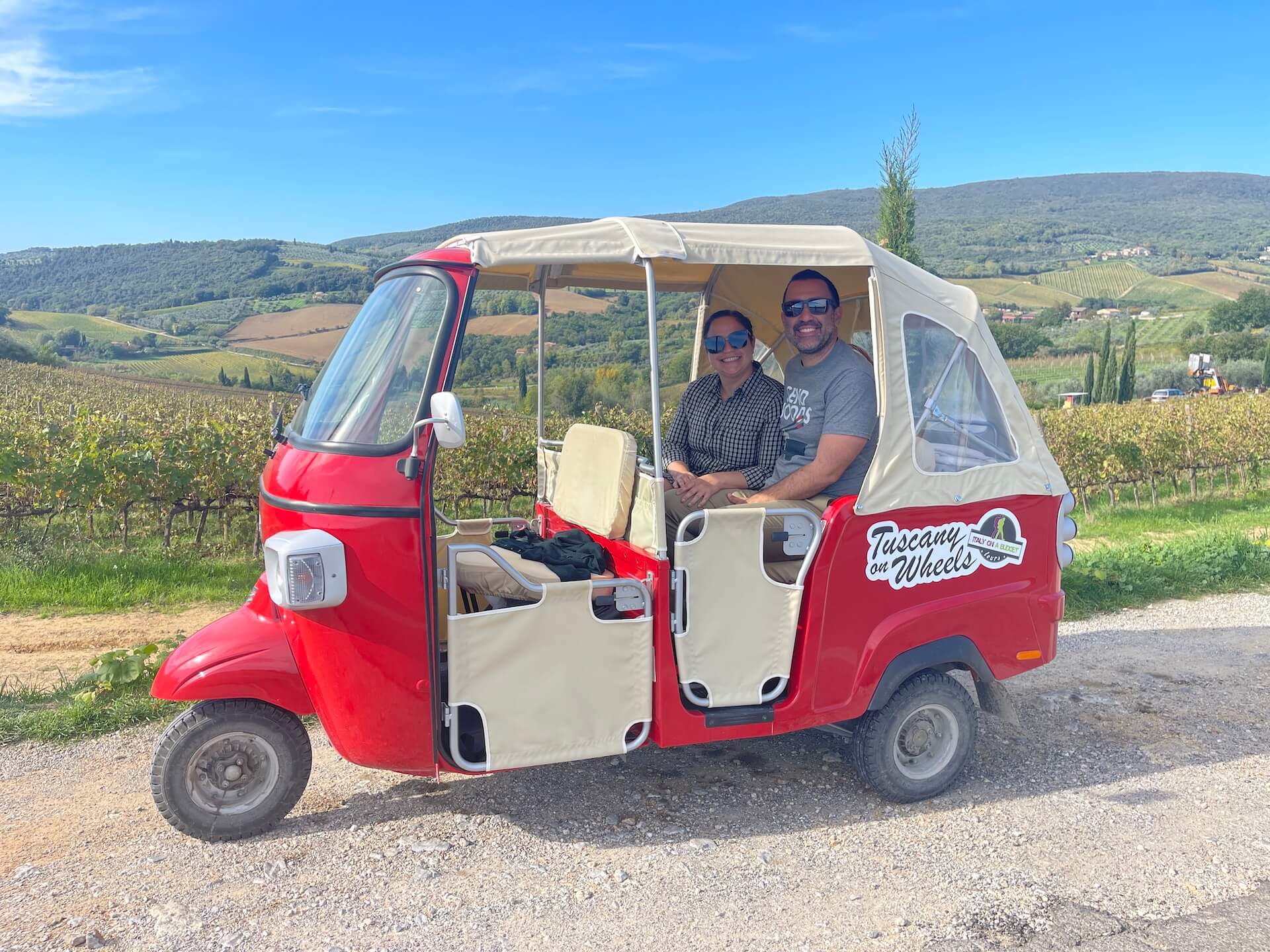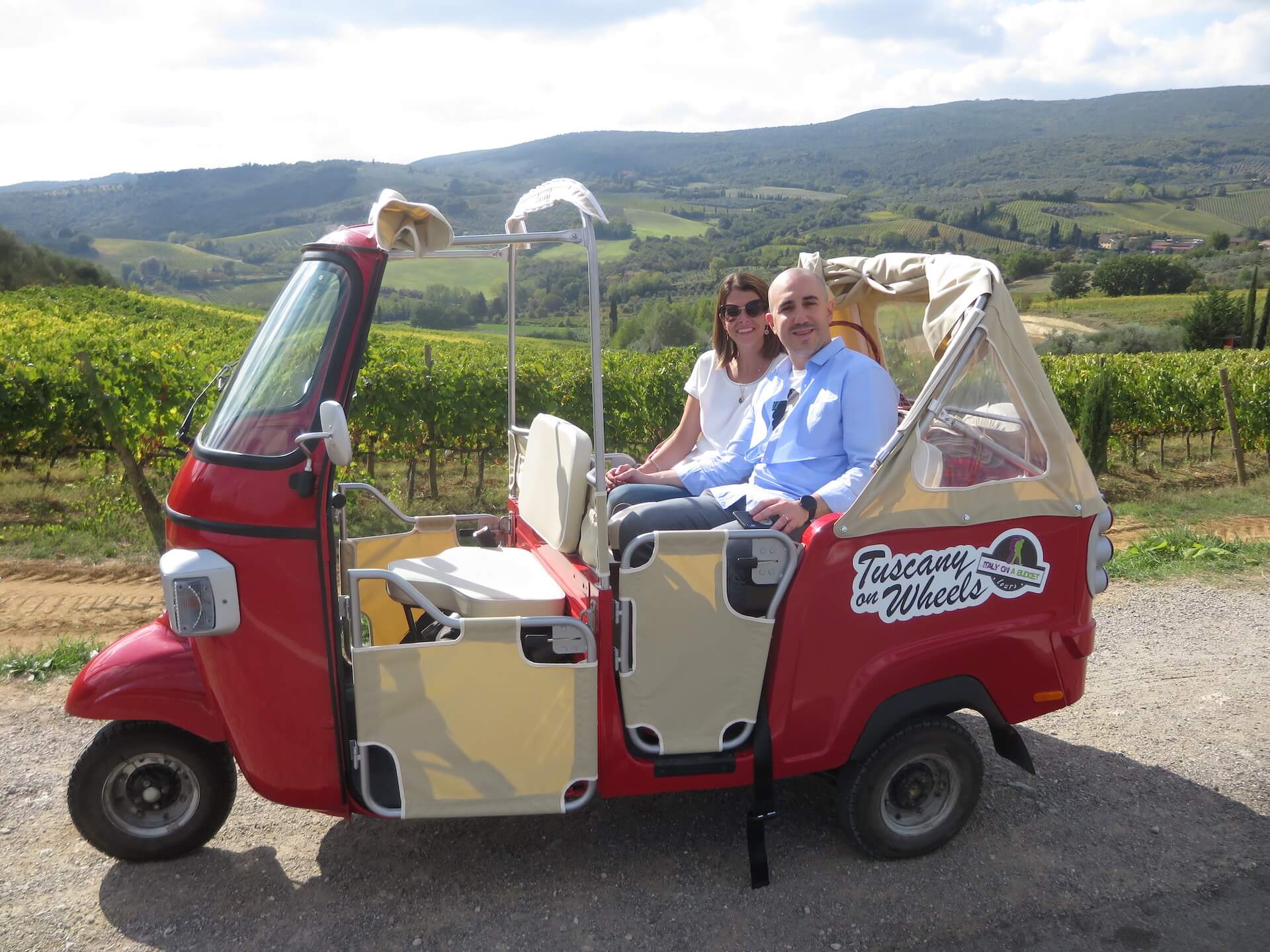 Join our day tour from Florence to the Chianti region on board a convertible Piaggio tuk-tuk on the rolling hills of Tuscany together with our driving guide. Enjoy the visit of one of the most beautiful Medieval villages in the area and the tour of a winery for lunch and wine tasting.