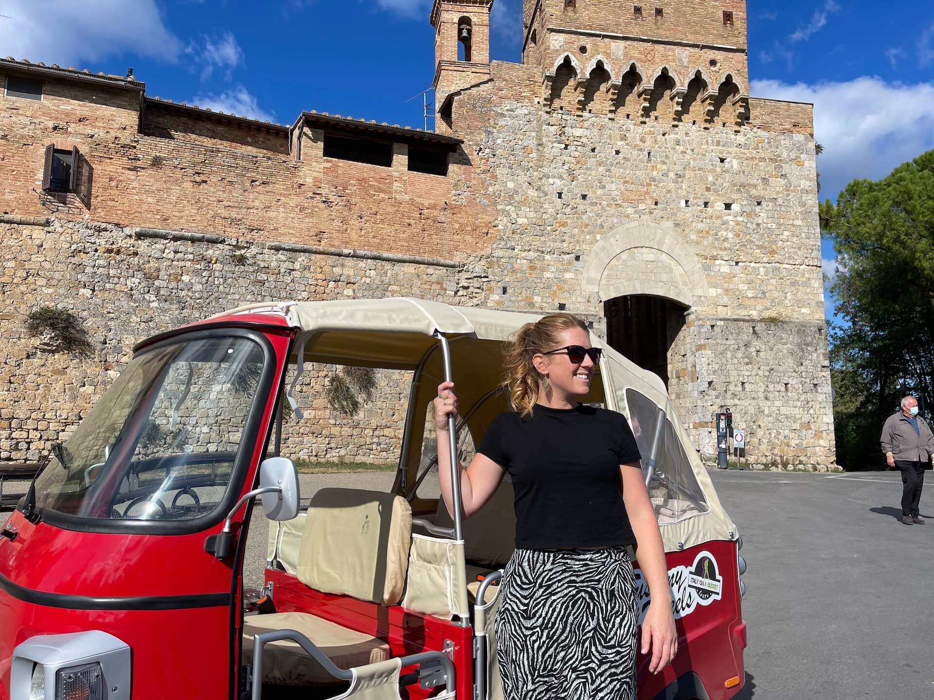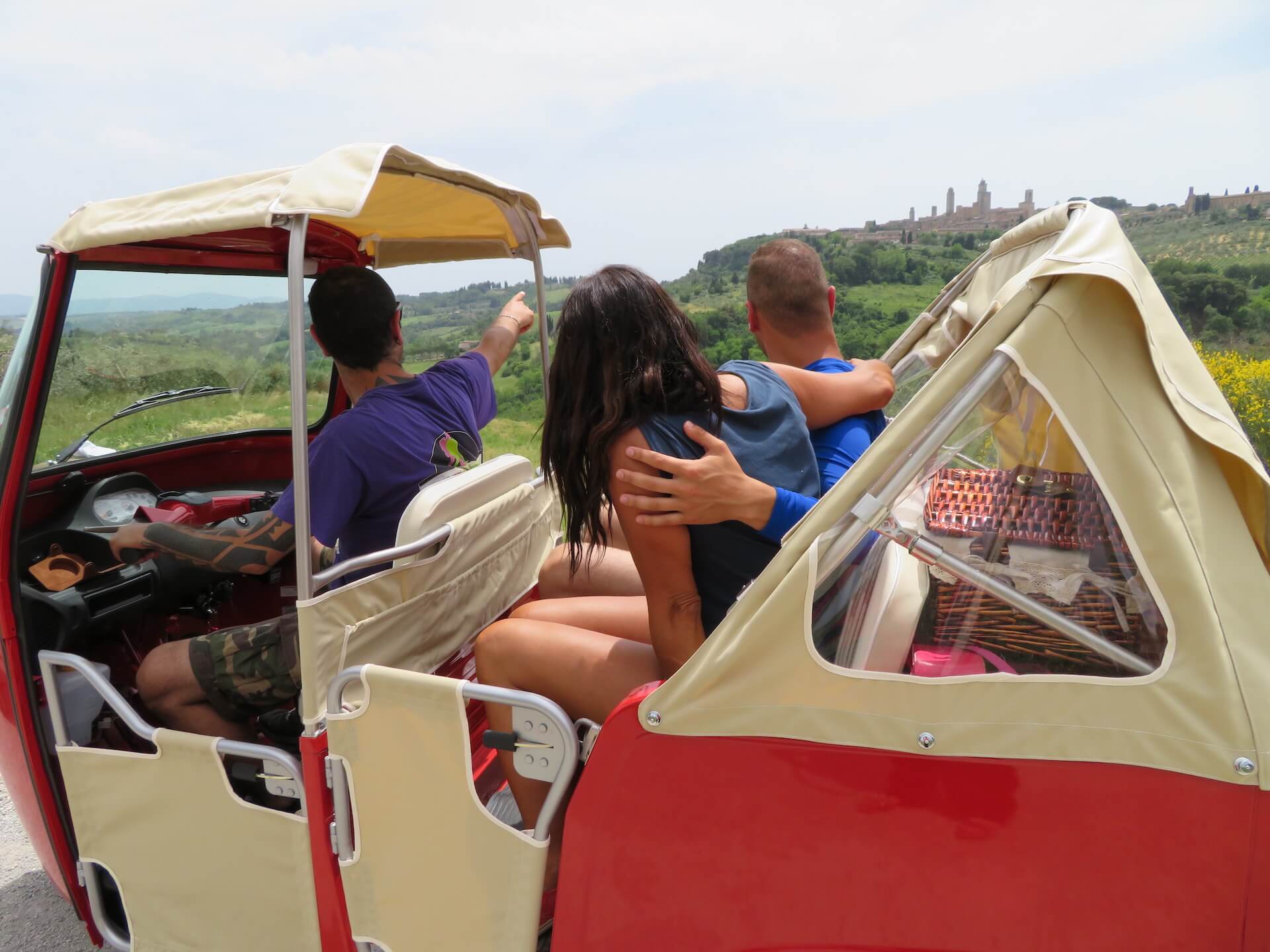 Please note the vehicle is approved to carry only two people + driver. No extra seats are available. The tour can be possibily combined with Vespas.